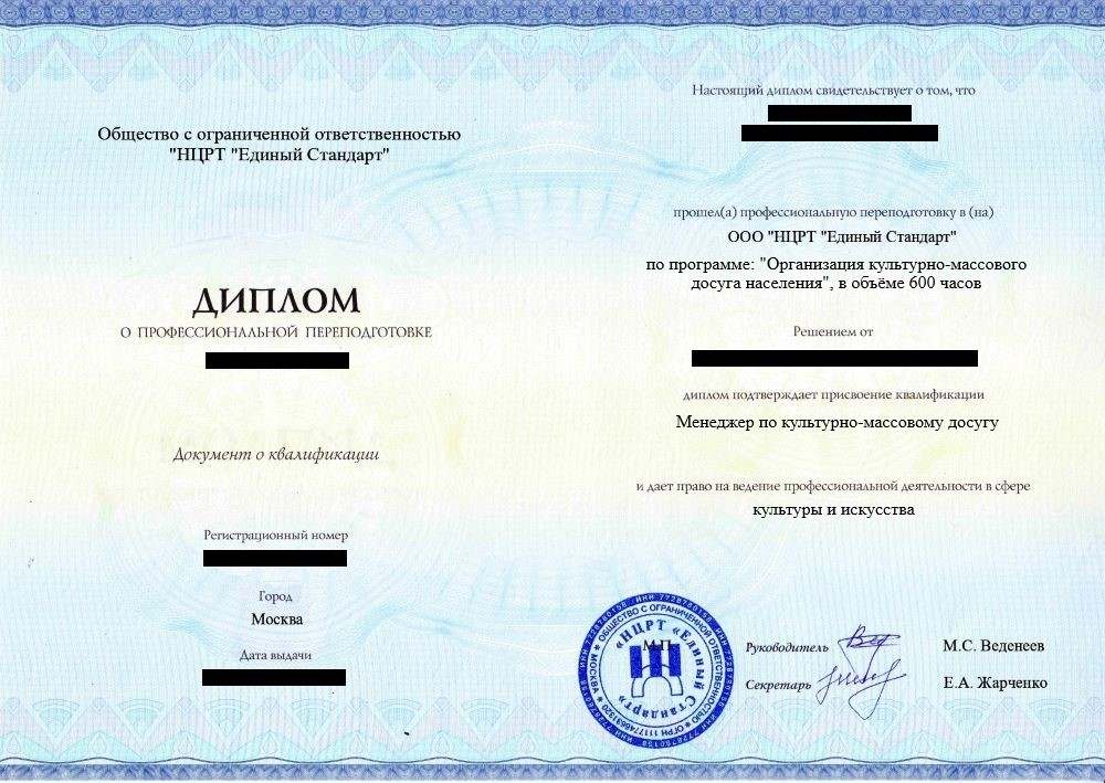 • «Менеджер по культурно-массовому досугу» с правом ведения профессиональной деятельности в сфере культуры и искусства