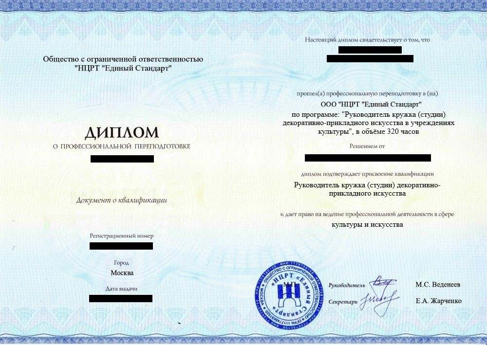 • «Руководитель кружка (студии) декоративно-прикладного искусства» с правом ведения профессиональной деятельности в сфере культуры и искусства
