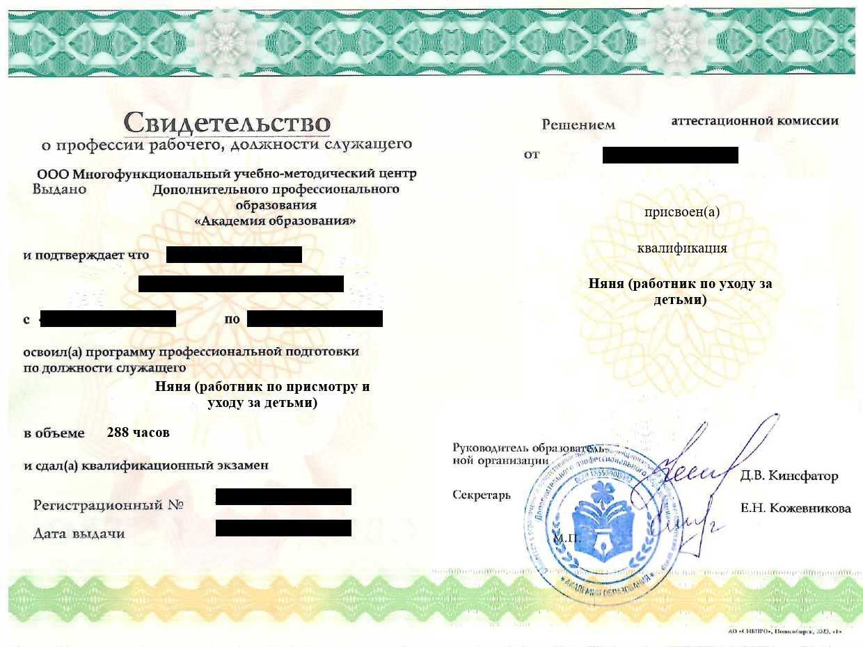 • Свидетельство о профессии рабочего, должности служащего установленного государством образца. Срок действия: бессрочно